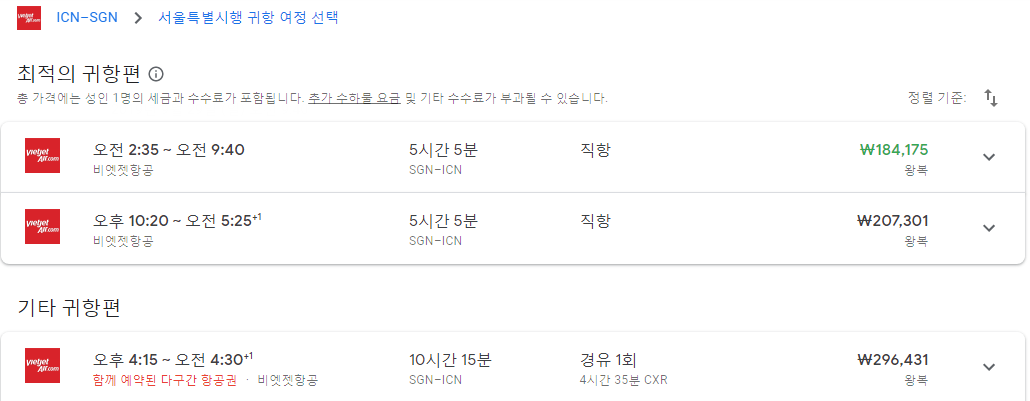 돌아오는 비행기는 오전 2시 35분에 출발하면 위에 금액 그대로이지만 시간을 변경하면
