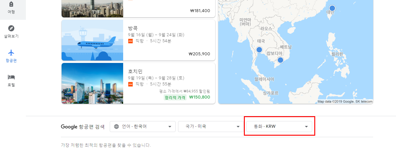 항공권 검색 페이지로 들어가서 원하는 통화로 선택해 주세요 해외에서도 사용하는 금액으로 설정하시면
