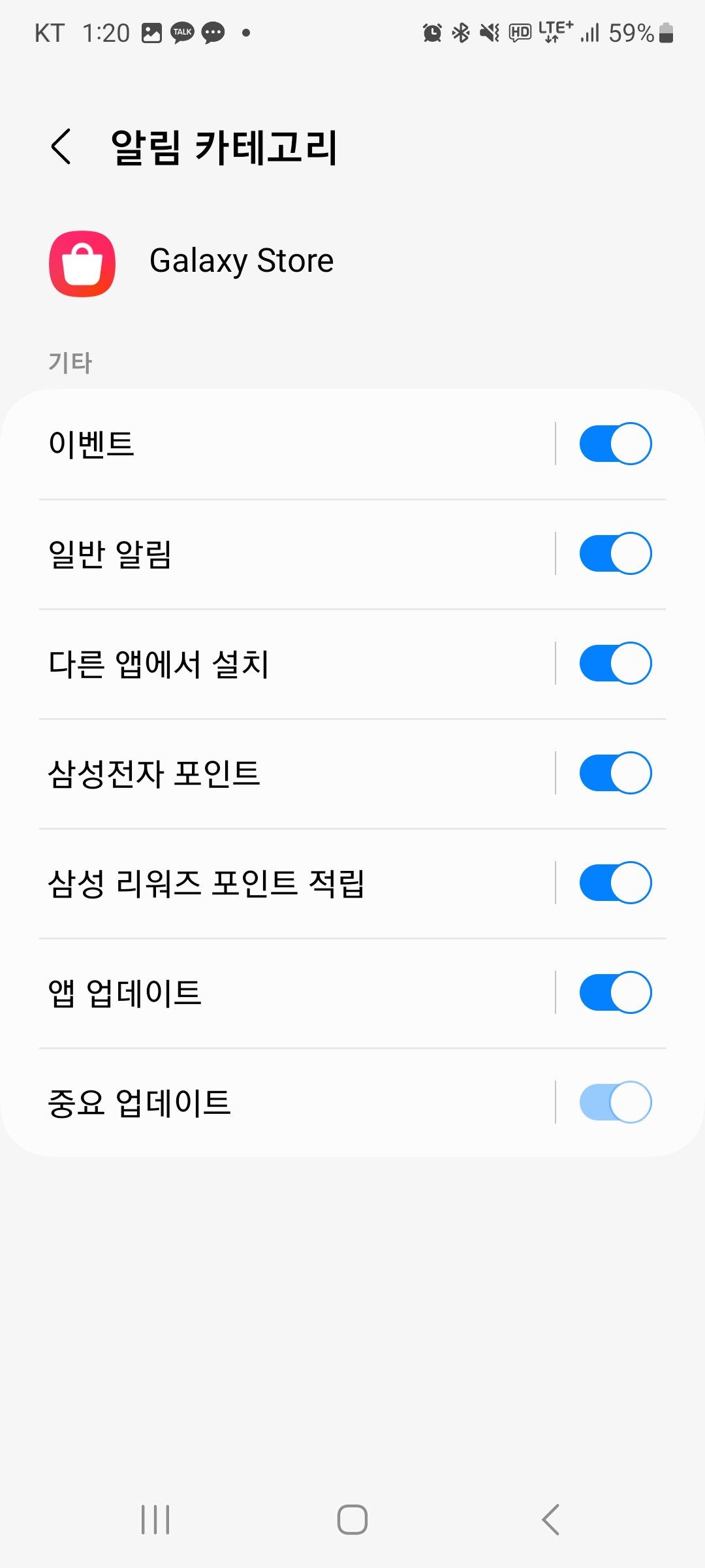 모든 항목을 비활성화 처리 해줍니다. 하지만 이번에도 중요 업데이트에서는 알림을 끌 수 없게 비활성화 되어 있네요 어떤게 중요업데이트 이고 중요라는게 어디까지 인지 모르지만.. 이건또 끌수가 없습니다.
