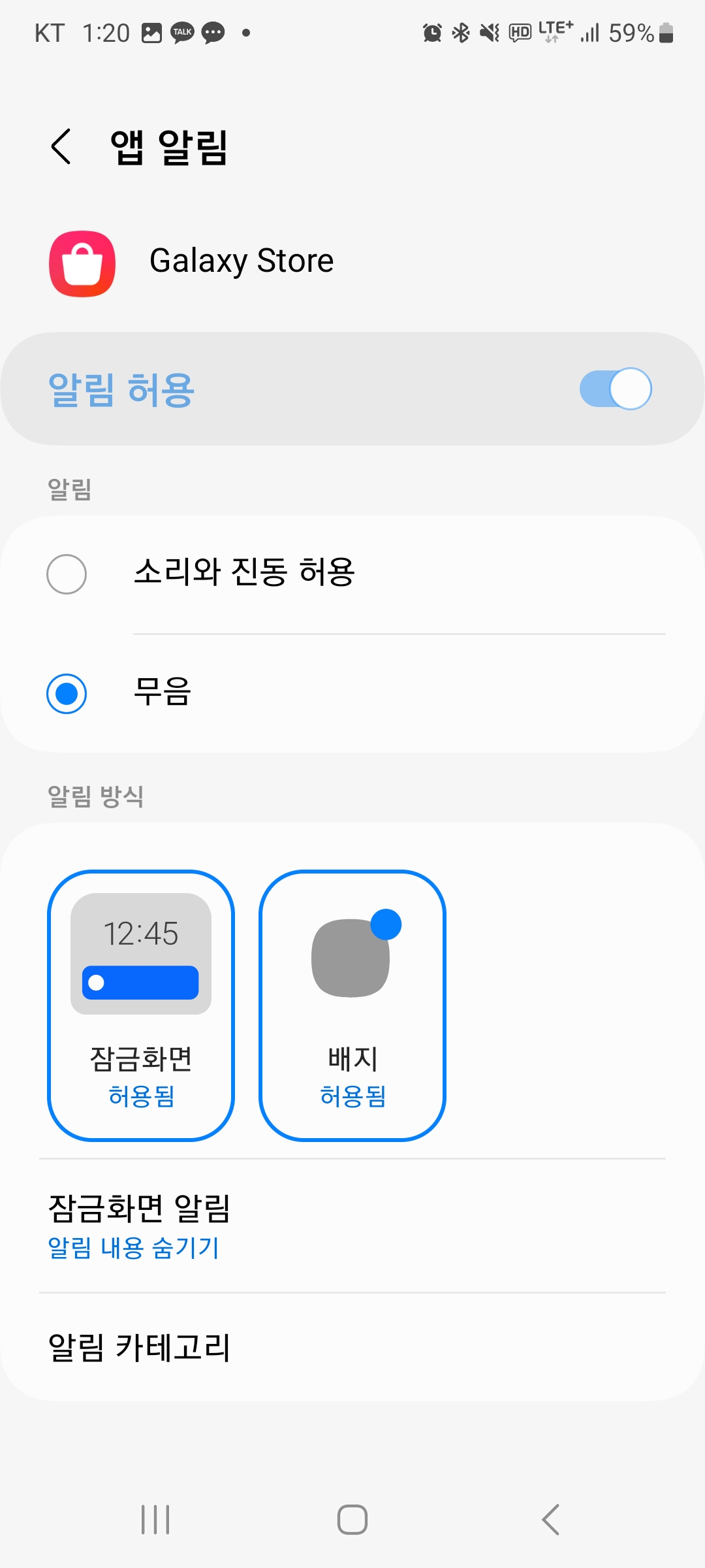 그리고 다시 나와서 알림방식 배지와 잠금화면을 모두 비활성화 처리 해줍니다.