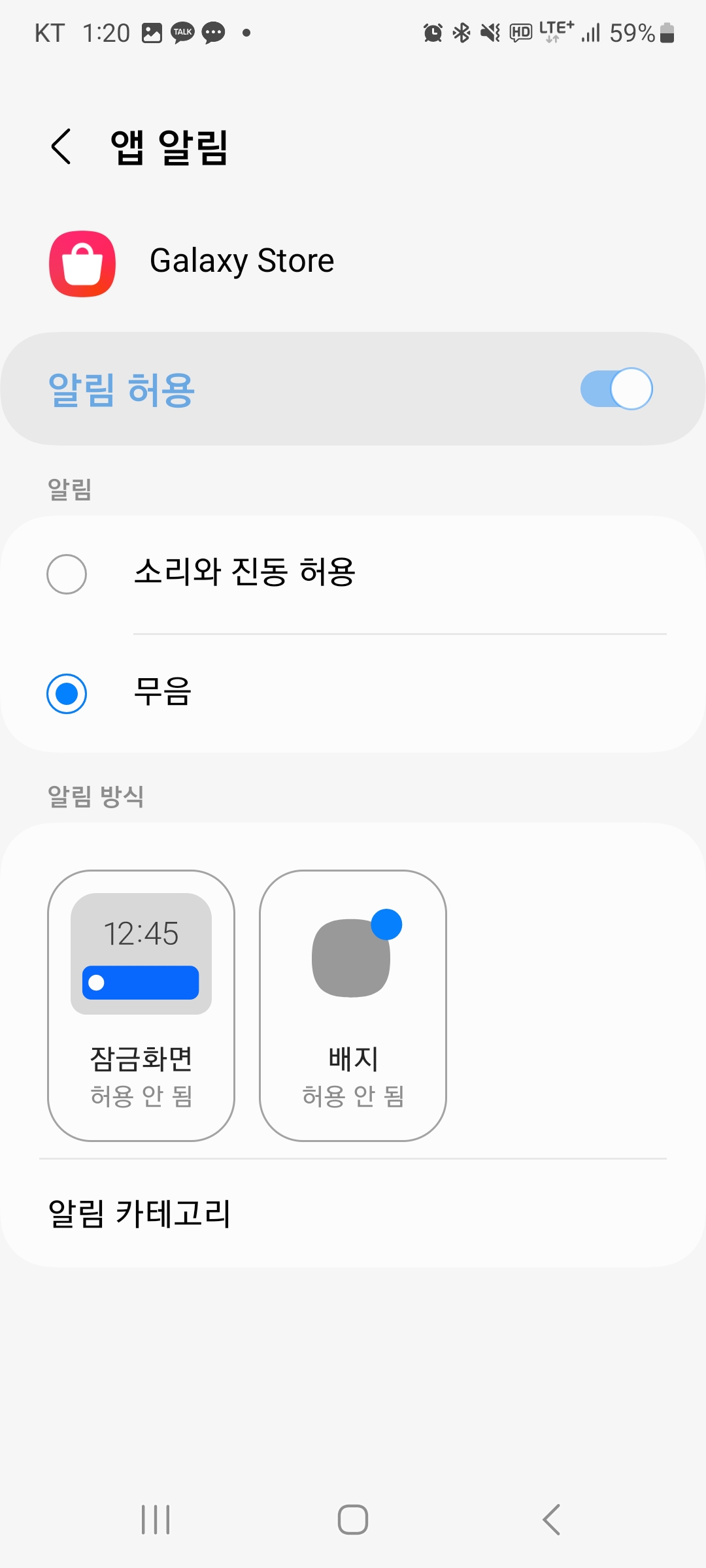 설정에 들어가서 보시면 사진과 같이 알림 허용 버튼이 흐릿하게 비활성화되신 걸 볼 수 있습니다. ON으로 되어 있으며 사용자가 끌 수가 없게 되어 있는 것입니다. 내 폰에 설치된걸 내 맘대로 하지도 못하다니 부글부글