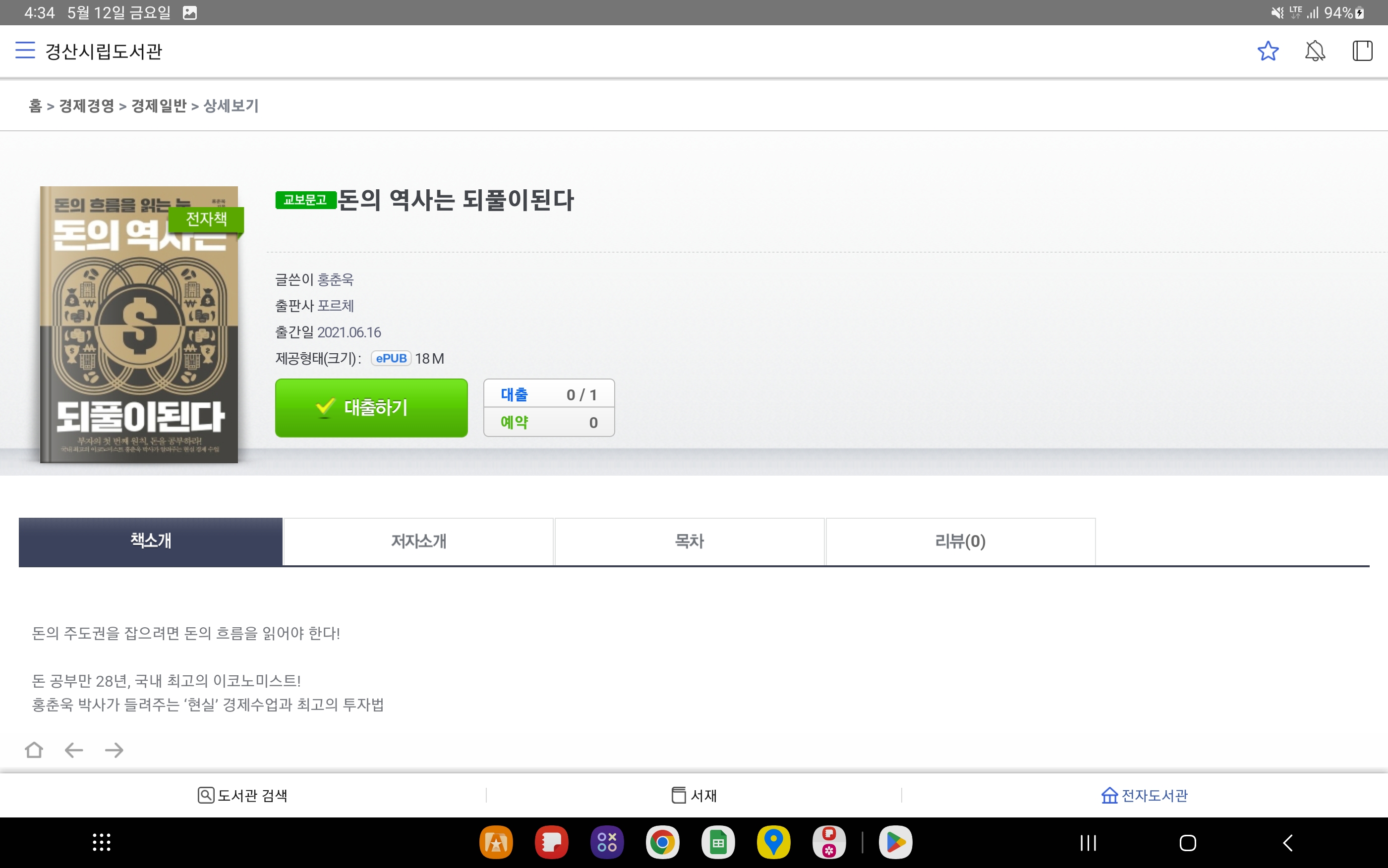 대출에 성공한 책은 태블릿에 다운로드하여 읽을 수 있으므로 와이파이가 되는 곳에서 다운받아서 인터넷이 안되는 비행기나 외부에서도 책을 읽을수 있습니다.