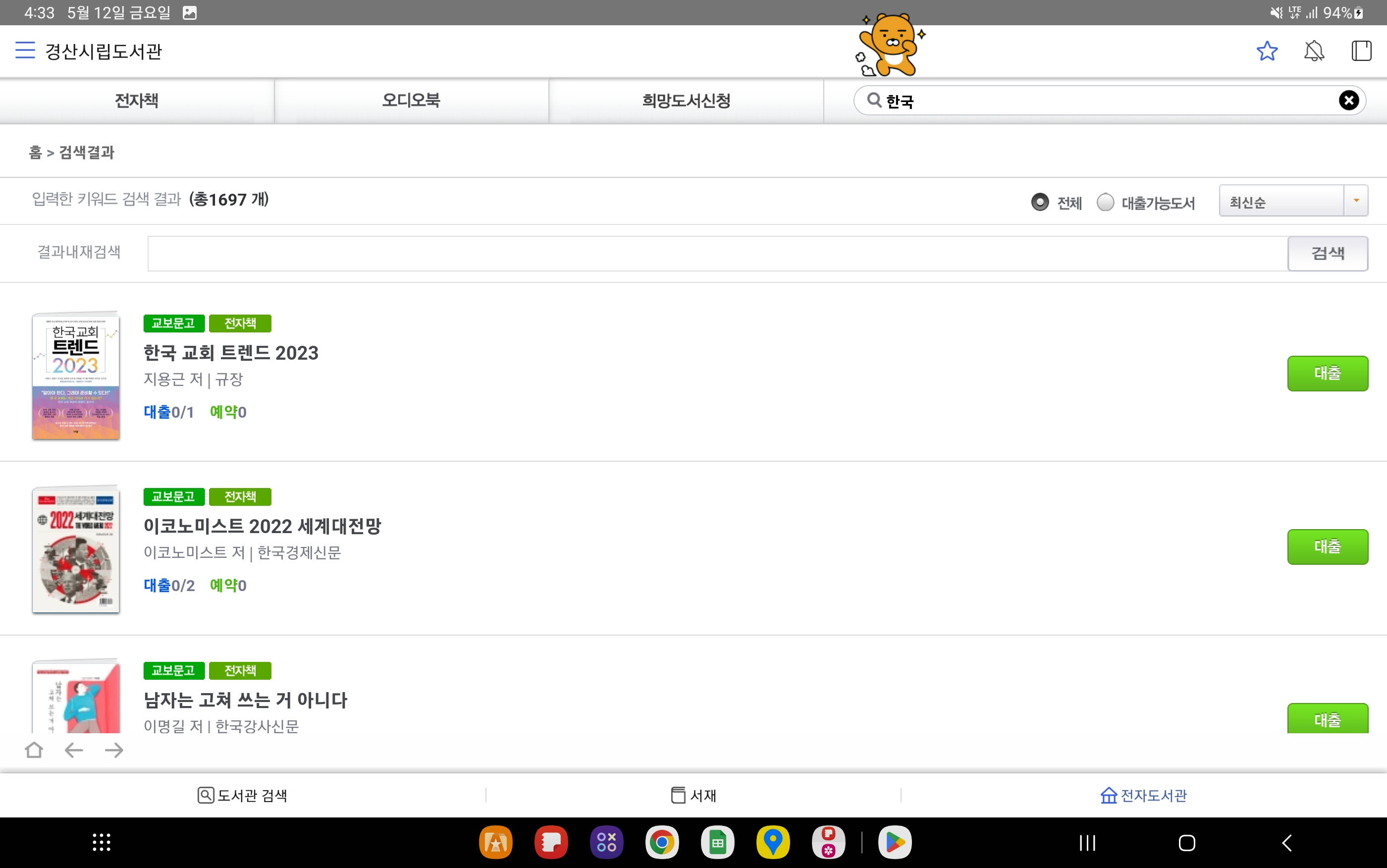 인터넷 검색결과 가장 많은 책을 보유하고 있다고 나와있는 경산신립 도서관을 검색했습니다. 원하는 책이 없다면 내가 사는 지역구 또는 국회 도서관이나 대학교, 중학교 심지어는 초등학교도 전자 도서관을 운영하는 곳이 있습니다. 그중에 원하시는 도서관을 검색해서 이용하시면 됩니다.