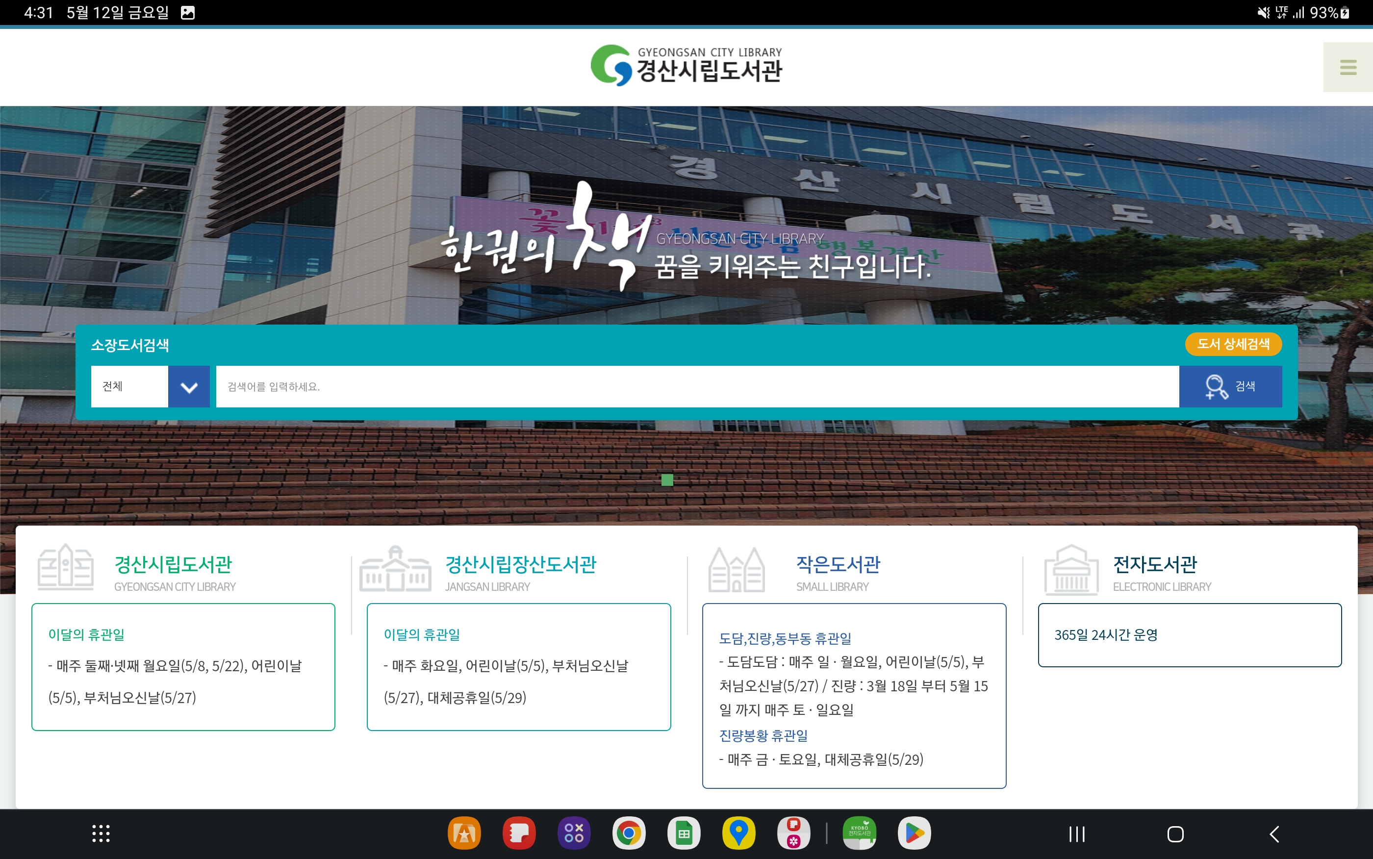 도서관에 들어가게 되면 책들이 리스트로 주르륵 나오지 않고 신작 자료만 나오네요 어플이 개발된 지 오래된 것인지 아니면 업데이트를 안 하는 것인지 모르겠지만 처음 사용하시는 분들은 많이 불편하실 수 있습니다.