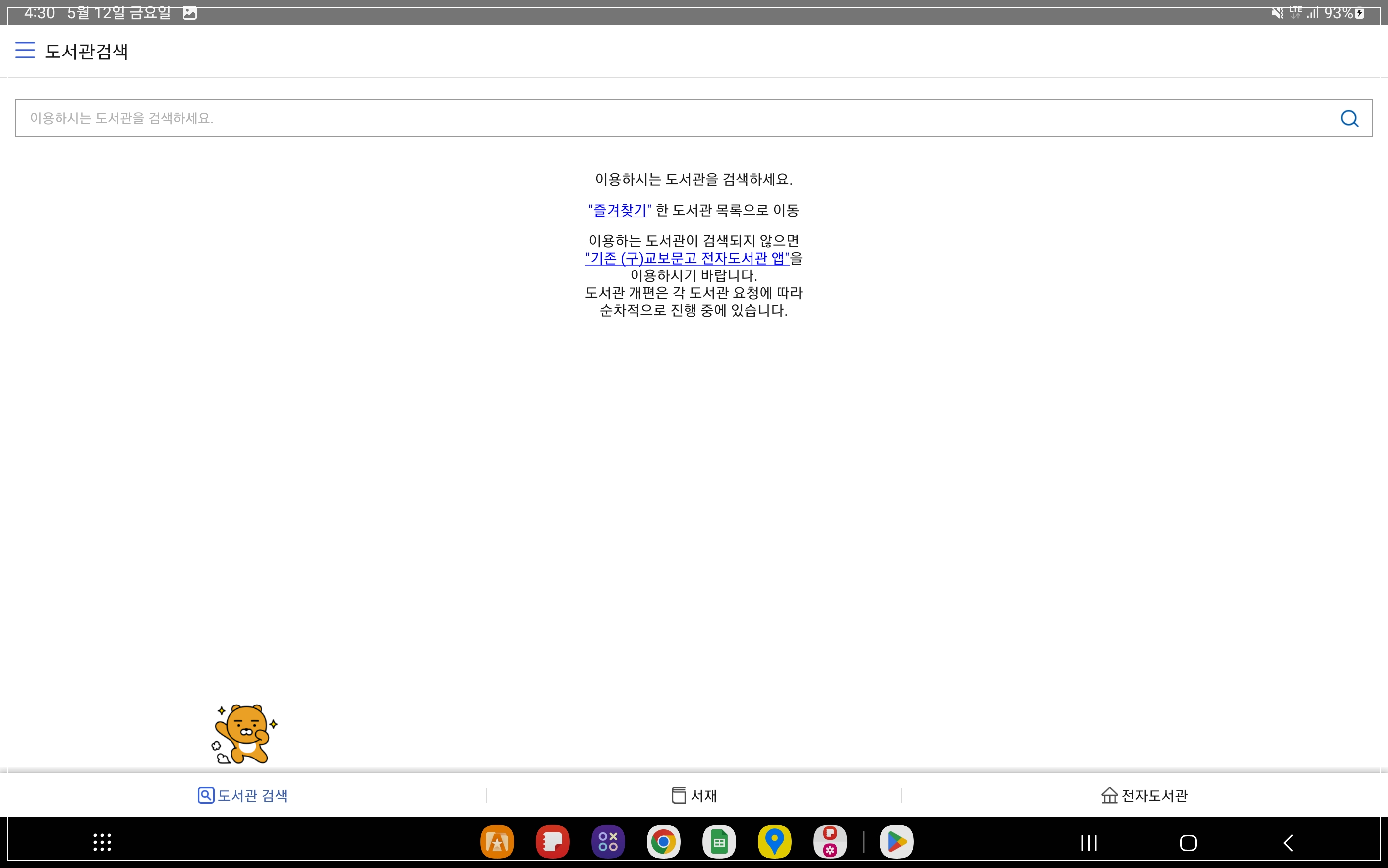 이제 어플에 대한 설치는 마무리가 되었습니다. 그런데 너무 휑하네요 아무것도 없어요 책도 없고 어디서 무엇을 할지 모를 정도로 휑하네요 왼쪽 아래 도서관 검색을 눌러 도서관을 검색해야 합니다. 라이언 아래에 도서관 검색 보이시죠? 저기입니다. 티스토리 여기는 왜 사진 편집 기능에서 화살표나 네모 표시 하는 기능이 없는 거야!! 카카오 하고 통합되더니 이모티콘도 죄다 카카오네 ㅡㅡ 암튼 저걸 눌러 주세요