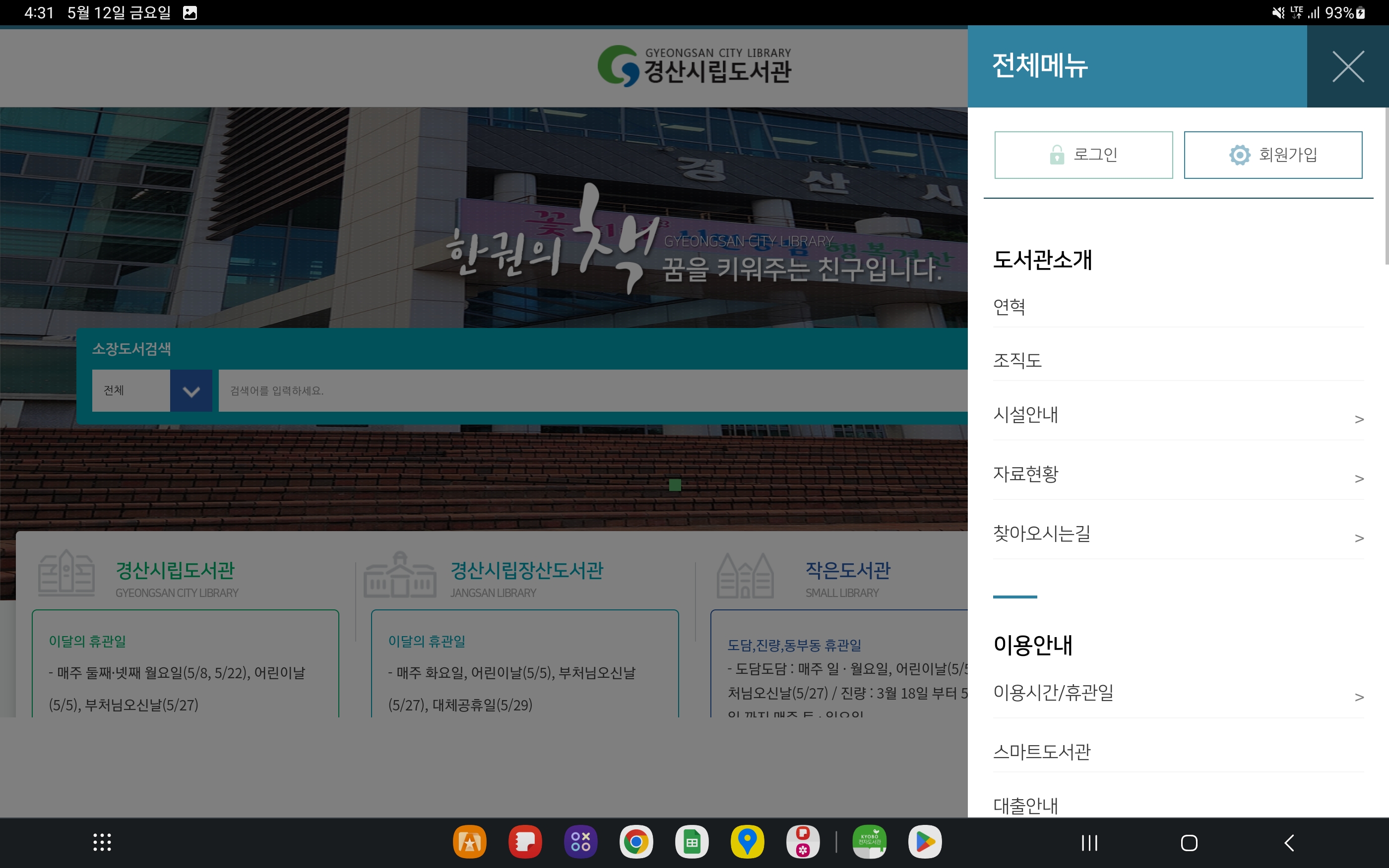 이곳은 온라인 도서관이기에 대출을 받기 위해서는 회원가입을 해야 합니다. 예시로 들어놓은 경산시립도서관 웹페이지로 들어가서(교보문고 어플에는 회원가입이 없어요) 회원가입을 해줘야 합니다. 국회 도서관을 가셨다면 국회 도서관 홈페이지 가셔서 가입을 해주세요. 오른쪽 상당 3줄 모양의 버튼을 클릭합니다.