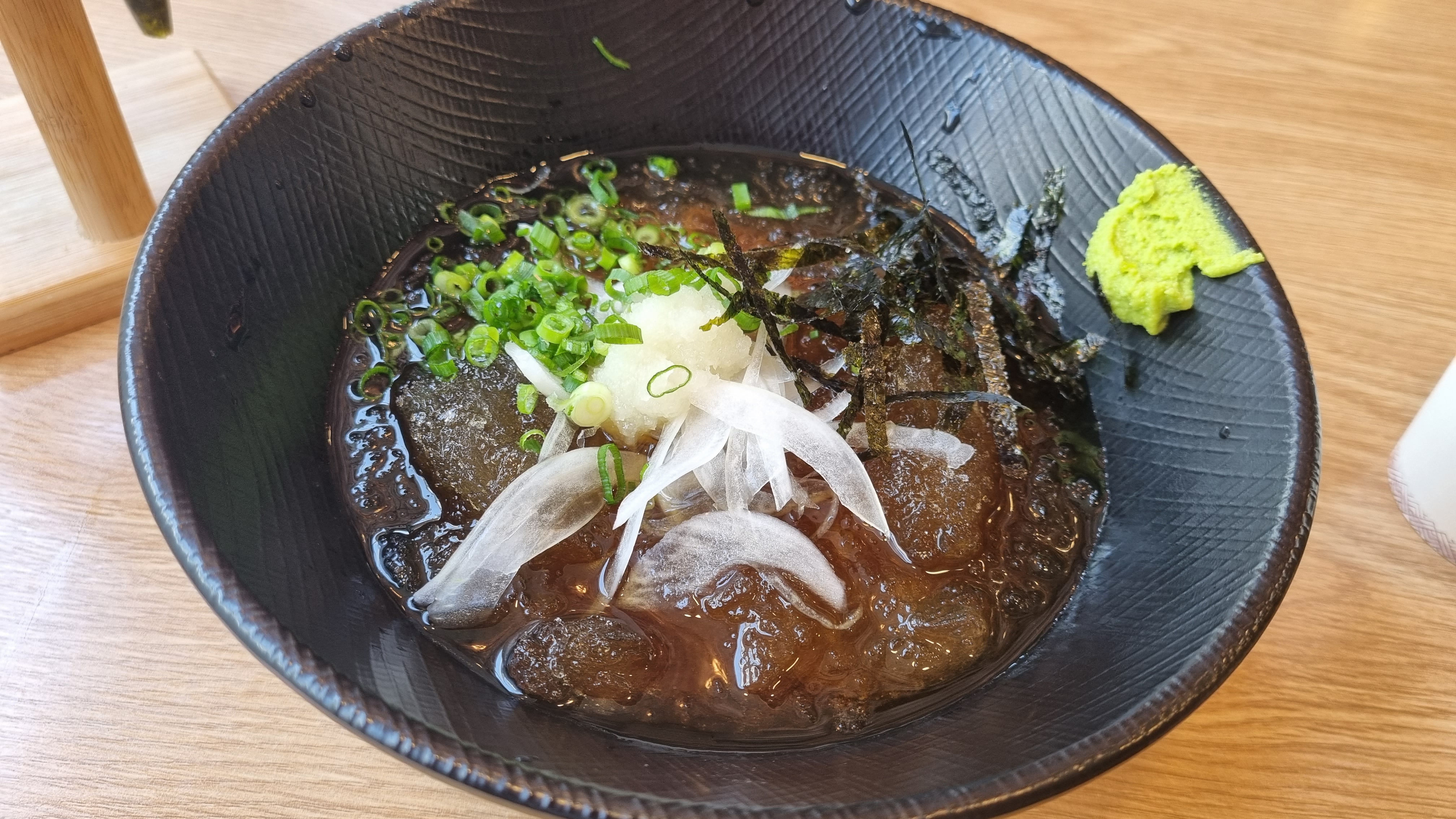 초밥을 다 먹고 이제는 냉모밀이 나왔습니다. 저는 모밀 면이 따로 나오고 육수에 찍어먹는 메밀 소바와 헷갈렸나 봐요 왜 이게 나오지?? 했다가 냉모밀과 모밀소바는 다른 것이구나 알았죠