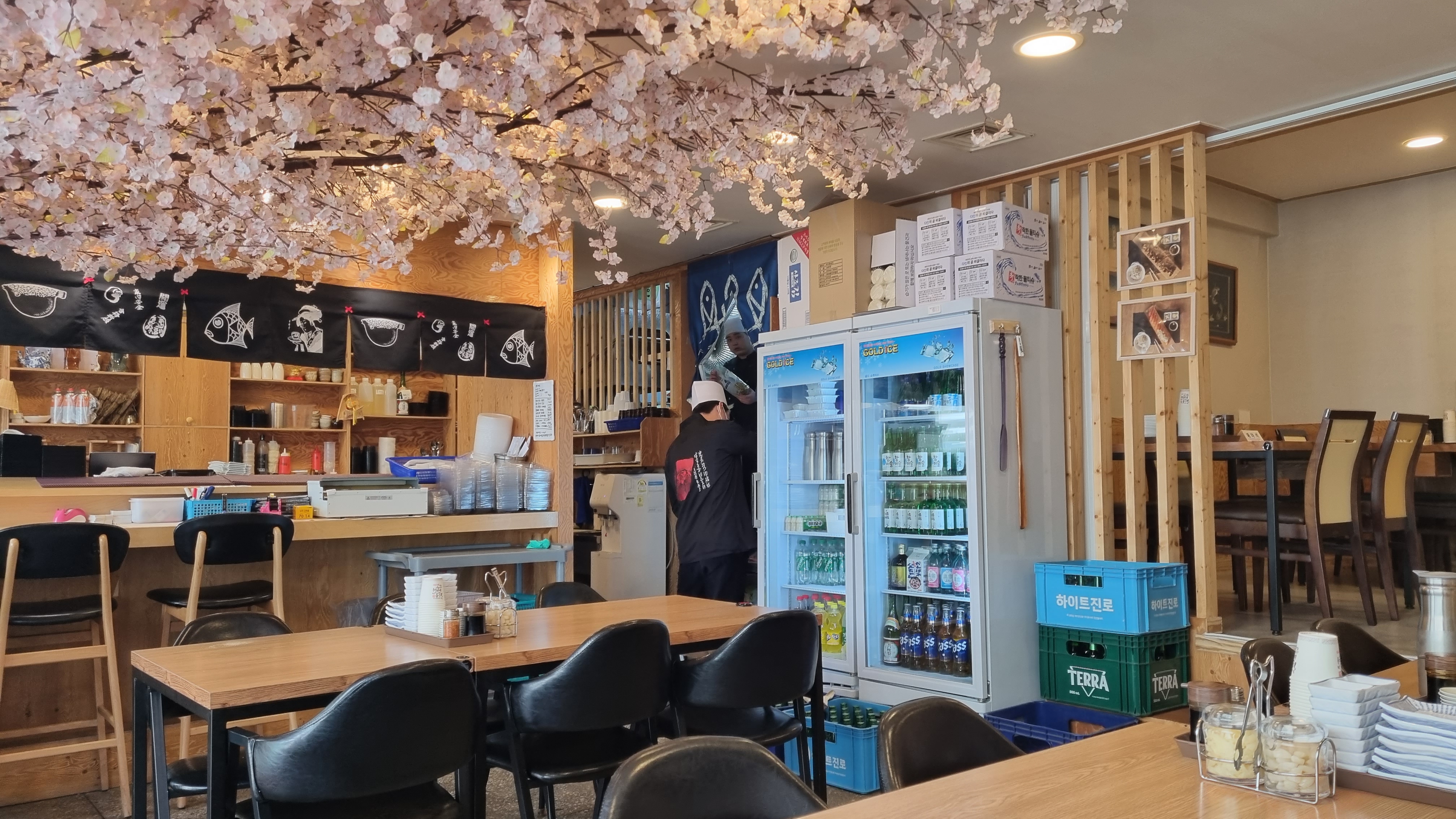 가게는 일식집답게 닷지 테이블도 있고 일반 테이블도 혼용으로 자리되어 있습니다. 벚꽃으로 장식을 해둔 게 전형적인 일식집 느낌을 느꼈습니다.