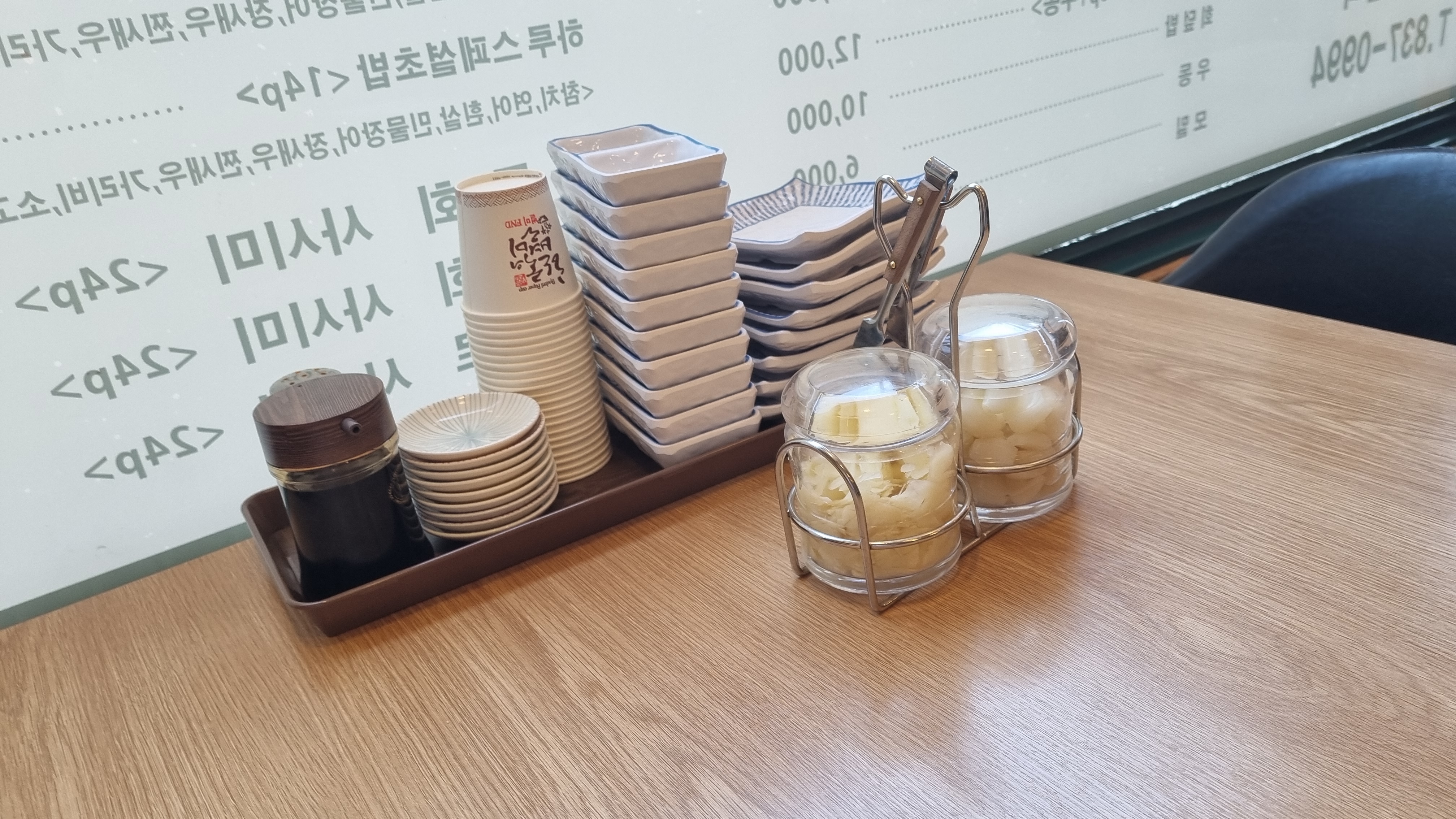 테이블에는 초생강과 락교, 그리고 간장이 준비되어 있어서 개인이 덜어서 먹을 수 있게끔 세팅이 되어 있고요