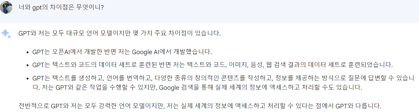 먼저 나는 GPT 보다 BARD가 늦게 만들어 졌으니 바드에게 서로 다른점을 물어 보았다.