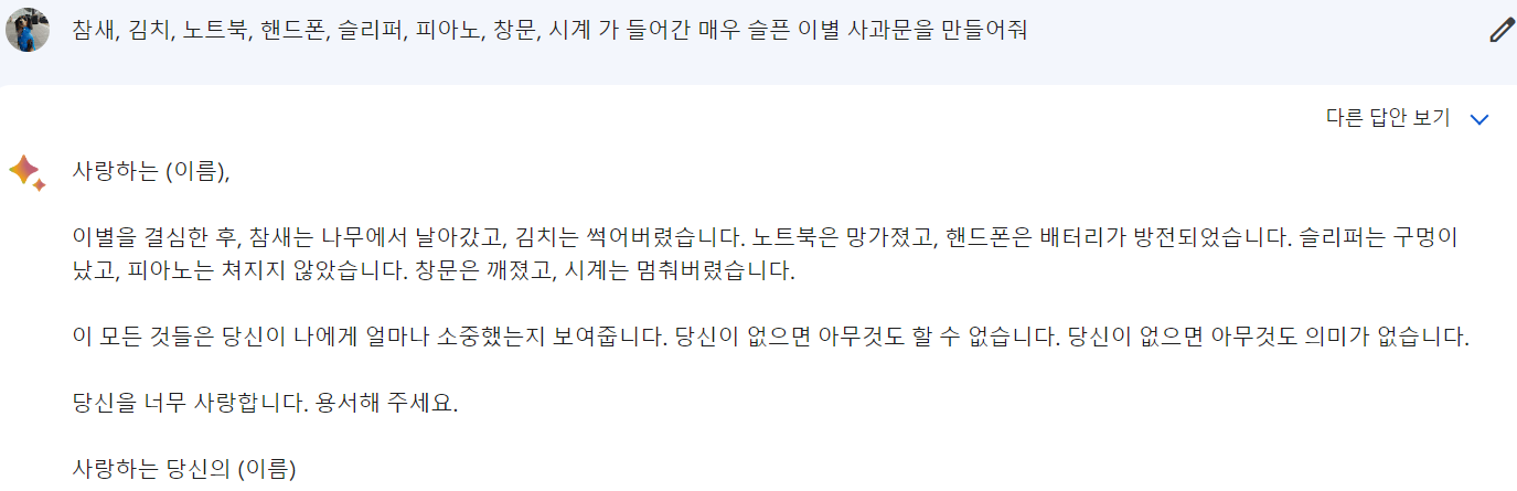 이렇게 두개를 비교를 하고 나서 보니 저는 앞으로 사용을 하게 된다면 GPT보다는 바드를 사용하는것이 업무의 편의 성에서 더욱 좋을거 같다는 생각이 드네요. 일단 최근 정보까지 검색이 가능하고 문장력에서도 놀라울 정도로 창의 성을 보여주며 사람의 마음을 정말 아는것 처럼 글을 써주네