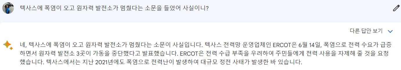 바드는 지금 텍사스에 날씨가 덥다는 것도 알고 얼마전 원자력 발전소가 정지한 사실도 알고 있습니다.