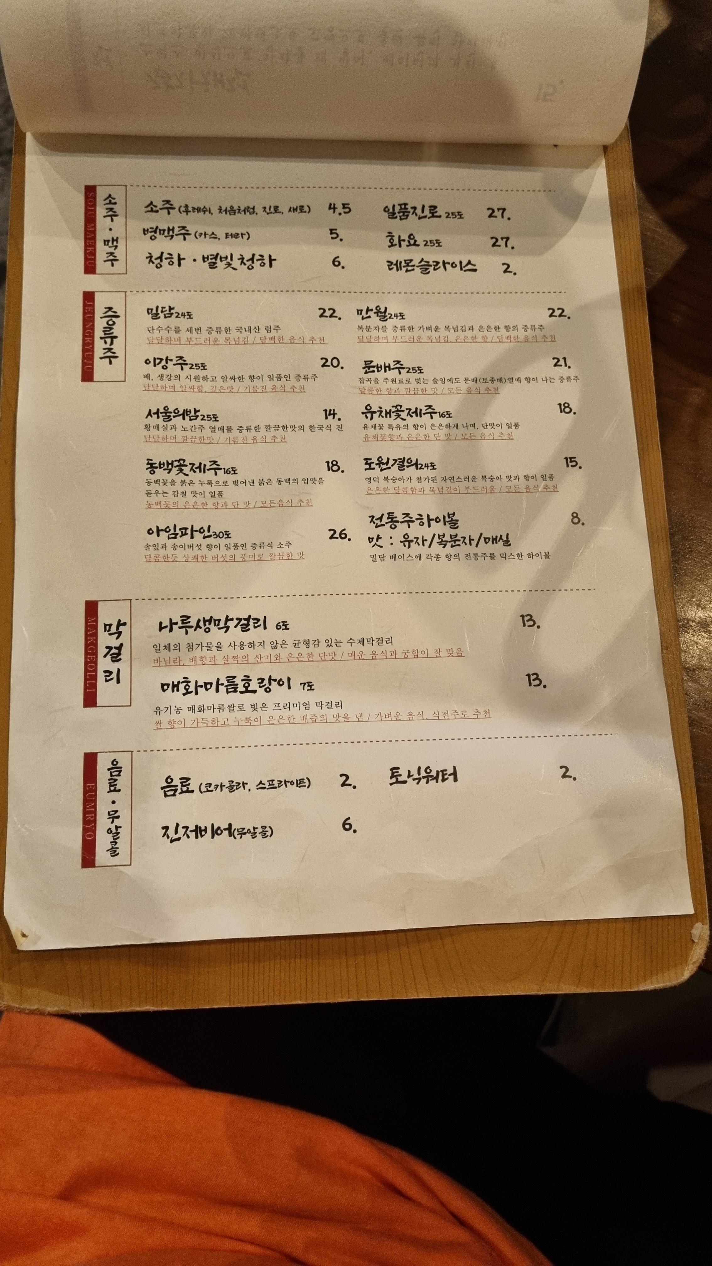 메뉴판입니다. 한식 주점 답게 한국 술과 막걸리가 있네요