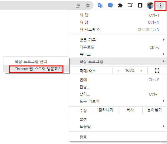 다음은 웹스토어에 들어가서 wavenet을 설치해 줄거에요 크롬오른쪽 상단을 보면 점 3개짜리 버튼을 누르고 확장프로그램으로 들어가 크롬 웹스토어에 들어가 줍니다.