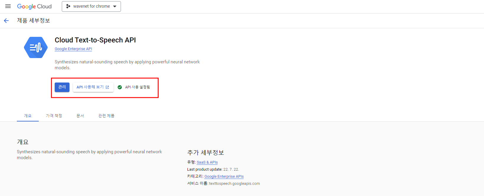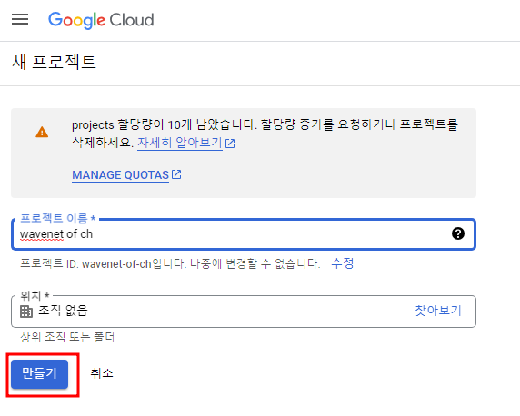 이름은 아무렇게나 지어도 상관은 없습니다. 하지만 구글클라우드는 웨이브넷 말고도 다른 기능들을 더 많이 가지고 있는듯 하니 일단은 wavenet of chrome으로 이름을 지어 주었습니다.