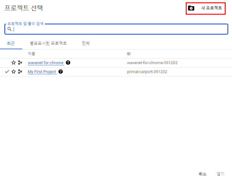 구글 클라우드를 사용할 준비는 이제 끝났습니다 왼쪽 상단의 새 프로젝트 생성 버튼을 눌러 주세요