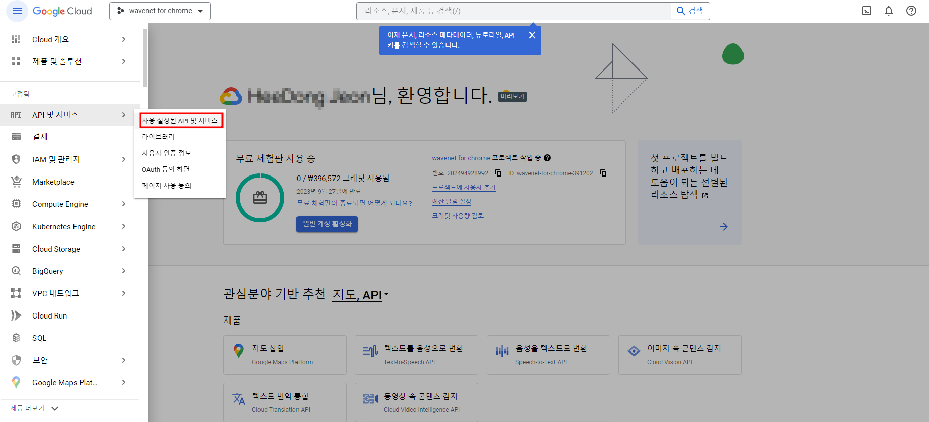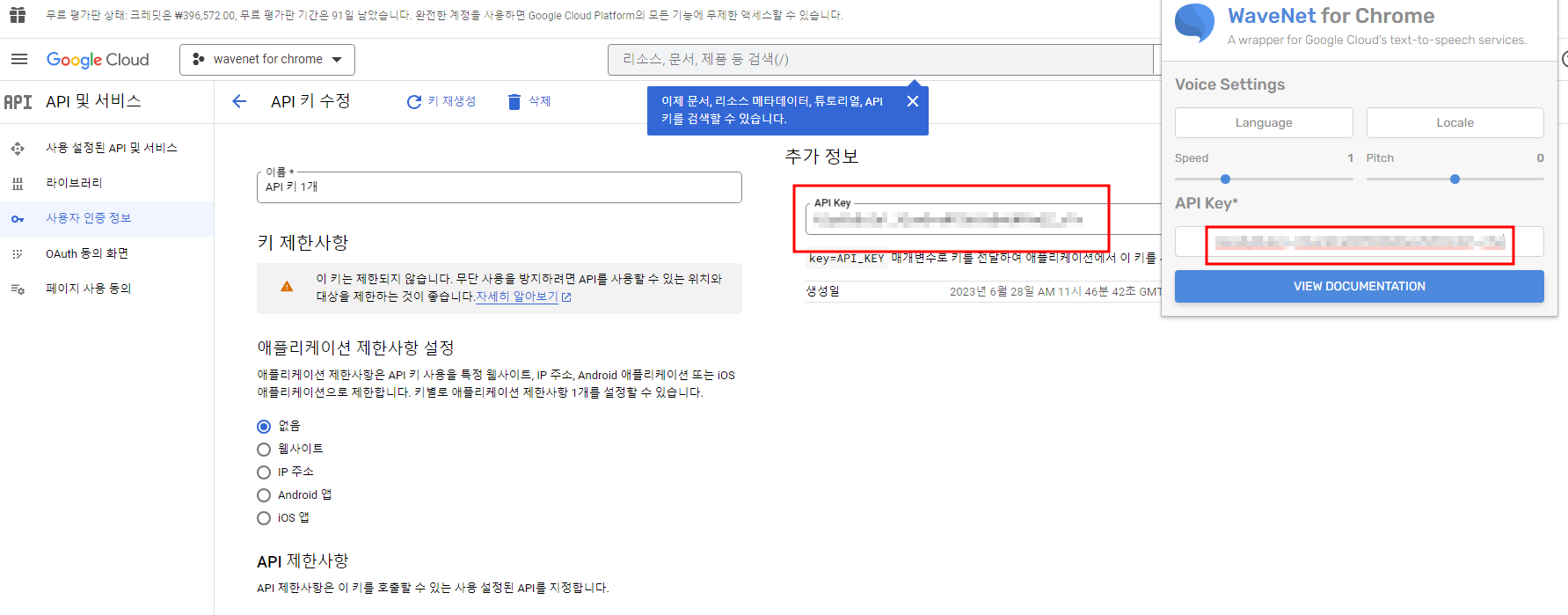api키라고 해서 개발자 키가 나옵니다. 그리고 그 키를 wavenet에 입력해 주세요