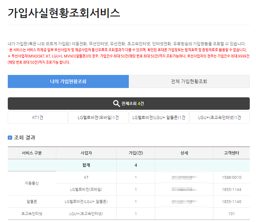 조회를 해보면 내이름으로 개통된 폰이 몇개가 있는지 무엇을 사용하고 있는지를 전부 확인할수 있습니다.